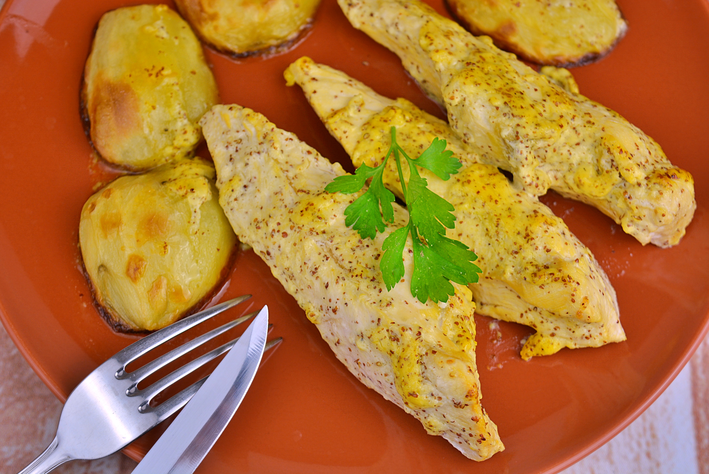 1- Comenzaremos pelando, limpiando y cortando las patatas en rodajas gruesas. Luego las colocaremos en una bandeja plana con sal y un chorro de aceite de oliva en el fondo. Luego sazonaremos por encima y pondremos otro buen chorro de aceite de oliva. Encenderemos el horno a 180ºC con calor arriba y abajo, y en que esté caliente meteremos la bandeja y hornearemos las patatas durante 40 minutos aproximadamente. 2- Mientras se van asando las patatas, cortaremos las pechugas de pollo en filetes o en tiras gruesas (a vuestro gusto), las sazonaremos y las embadurnaremos bien en mostaza de Dijon, dejándolas todas en un bol para que maceren durante el tiempo que tarden las patatas en asarse. 3- Una vez estén las patatas asadas, sacaremos la bandeja del horno y colocaremos los trozos de pechuga encima de éstas. Luego volveremos a meter la bandeja al horno y asaremos las pechugas de pollo durante 15 minutos más o menos. 4- En que el pollo esté bien asado, retiraremos la bandeja del horno y esperaremos a que se enfríe un poco todo antes de llevarlo a la mesa a para disfrutar de estas pechugas a la mostaza con patatas asadas.