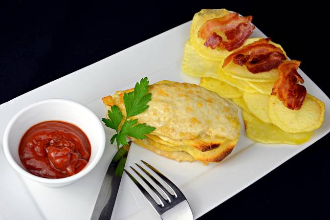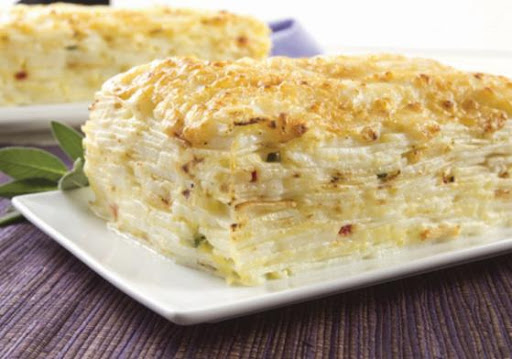 1- Comenzamos pelando, limpiando y cortando las patatas en rodajas finas. Luego las freiremos en abundante aceite con un poco de sal. Mientras se fríen, en otra sartén iremos cocinando las pechugas a la plancha. 2- Una vez tengamos todo hecho, dispondremos una bandeja plana para el horno e iremos montando los milhojas teniendo en cuenta que la primera y la última capa deben ser filetes. En las capas de patatas pondremos las suficientes para que cubran la pechuga. 3- Acto seguido cubriremos los milhojas con queso rallado y encenderemos el gratinador del horno. 4- En que se haya calentado un poco, meteremos la bandeja y gratinaremos los milhojas hasta que el queso quede fundido y doradito. 5- Mientras se van gratinando, freiremos unas lonchas de beicon en aceite bien caliente para que queden bien churruscaditas. 6- Cuando tengamos todo listo, llevaremos los milhojas rápidamente a la mesa a comerlos antes de que se enfríén. Y ya está amigos, hemos terminado nuestra receta de hoy.