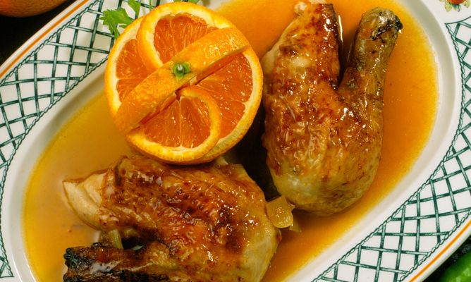 1- Comenzamos encendiendo el horno a 180ºC con calor arriba y abajo. Mientras se calienta colocaremos los jamoncitos de pollo en una bandeja con un chorro de aceite de oliva y sal. En que esté caliente el horno, metemos la bandeja y asamos los jamoncitos durante 45 minutos aproximadamente. 2- Durante el asado, prepararemos la salsa de naranja con verduras. Pondremos a sofreír en una sartén con aceite de oliva cubriendo el fondo los ajos, la cebolla y el pimiento picados finito. 3- Cuando la cebolla comience a transparentar, agregaremos la berenjena cortada en trocitos y la ralladura de naranja. Después pondremos un poquito de agua si veis que se pega la verdura. 4- En que tengamos listas la verduras, agregaremos el zumo de naranja mezclado con la fécula de maíz. 5- Ahora dejaremos que la salsa reduzca un poco y se quede más espesita. En el momento que tengamos el pollo y la salsa listos, solo tenemos que juntarlos en un plato y comerlos.