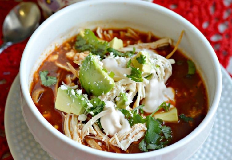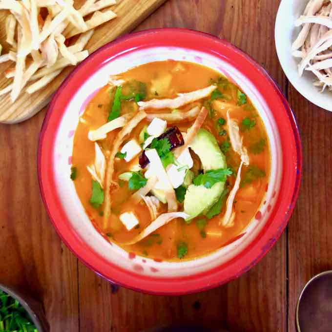 1- En una olla coloca una cucharada de aceite, la cebolla, el ajo y el jitomate, cocina por 5 minutos y agrega los chiles, la tortilla, el caldo y licua. 2- Regresa al fuego, agrega el epazote, sal, pimienta y cocina por 15 minutos. 3- En una olla con aceite caliente fríe las tortillas por 5 minutos o hasta que estén doradas a fuego medio. Reserva sobre un plato con papel absorbente. 4- Sirve el caldo sobre un plato sopero y decora con las tortillas fritas, una cucharada de crema acida, el queso oaxaca, los cuadritos de aguacate, el chicharrón y el chile en rodajas y frito. Disfruta con una deliciosa naranjada.