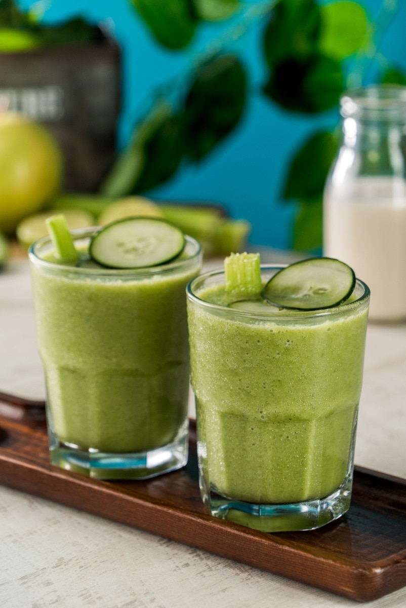 1-Agrega a la licuadora el pepino, la espinaca, el apio, la manzana, la piña, el nopal, el jugo de limón, el jengibre y leche de soya de almendra, licúa hasta integrar por completo. Sirve en vasos de vidrio y decora con rebanadas de pepino y apio.
