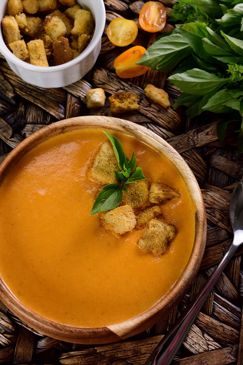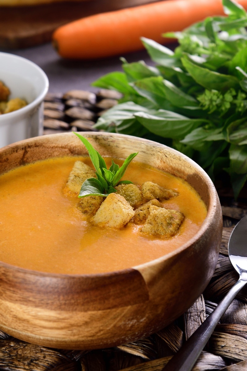 1- Precalienta el horno a 200° C. 2- Coloca en una charola la cebolla, la zanahoria, el jitomate, el ajo, el aceite de oliva, agrega sal, pimienta entera, y tomillo. Hornea hasta que estén los ingredientes suaves y cocidos. Retira del horno enfría y reserva. 3- Licúa los ingredientes horneados con el caldo de verduras, la leche, la crema ácida y la albahaca fresca, hasta obtener una mezcla suave y tersa. 4- Calienta una ollita a fuego medio con la mantequilla y cocina la crema durante 10 minutos, sazona con sal y pimienta. 5- Sirve la crema decora con albahaca fresca y crotones. Disfruta.