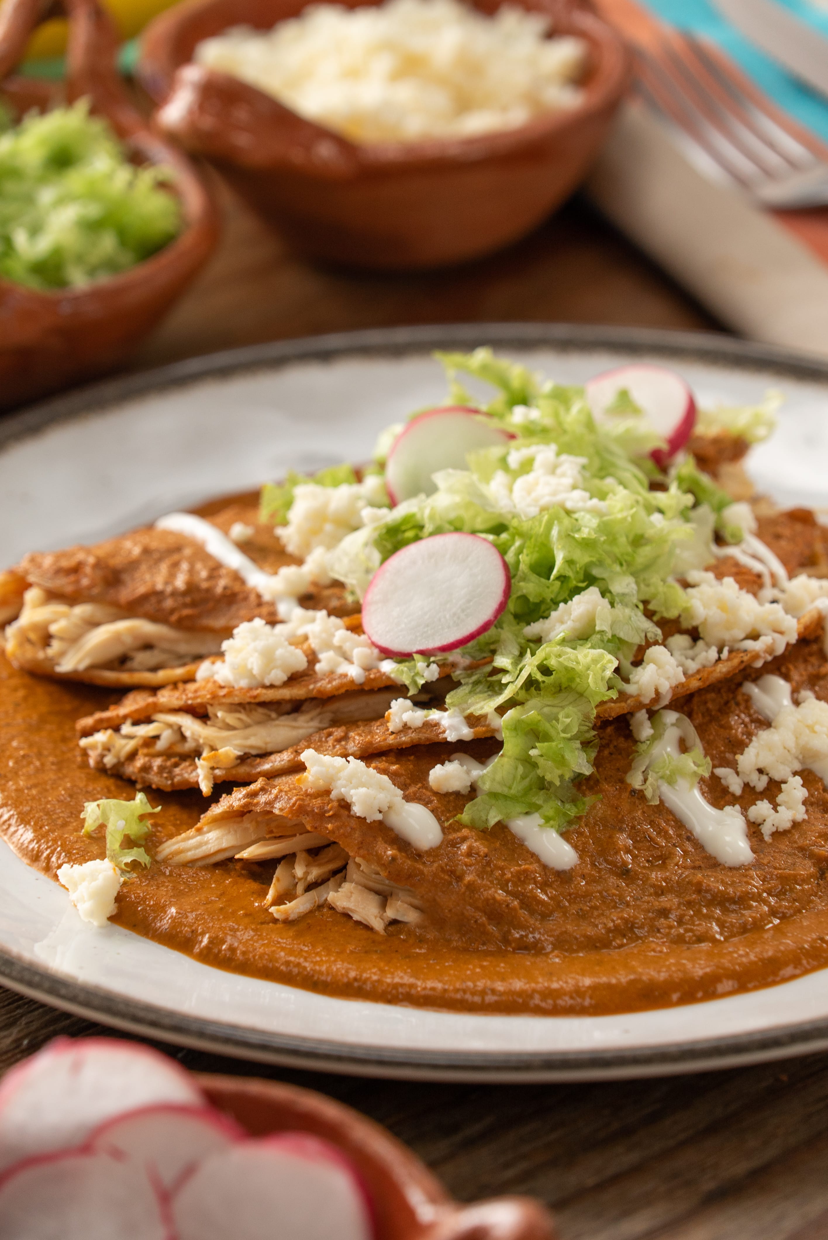 1- En un comal asa las pepitas de calabaza, los cacahuates y las semillas de ajonjolí; procura no dejar de mover para no tostar demasiado; retira y reserva. Sobre el mismo comal asa los jitomates hasta que se tatemen, tuesta las especias (comino, pimienta gorda, clavo y canela). Reserva. 2- En una olla con manteca caliente, fríe la cebolla con los ajos, sin quemar demasiado. Dora el pan por ambos lados, retira hasta que obtengas el color deseado. Agrega más manteca y fríe los chiles ligueramente, para evitar que la preparación se amargue; vierte el caldo de pollo, tapa y cocina por 8 minutos. Licúa los chiles junto con la cebolla, el ajo, los jitomates, las semillas y especias tostadas, obtendrás una mezcla espesa y rojiza. Reserva. 3- En una ollita con manteca caliente vierte la salsa que licuaste, agrega caldo de pollo y sal. Cocina por 12 minutos a fuego bajo. Reserva. 4- Para las enchiladas, en una sartén con aceite caliente fríe ligeramente las tortillas, escurre y baña con la salsa de pipián por ambos lados (si deseas puedes apoyarte de una brocha). Rellena con el pollo desmenuzado, cierra y repite con todas las tortillas y hasta terminar el relleno. 5- En un plato extendido vierte un poco de pipián rojo, coloca las enchiladas, decora con la crema, la lechuga, el queso y el rábano al gusto.