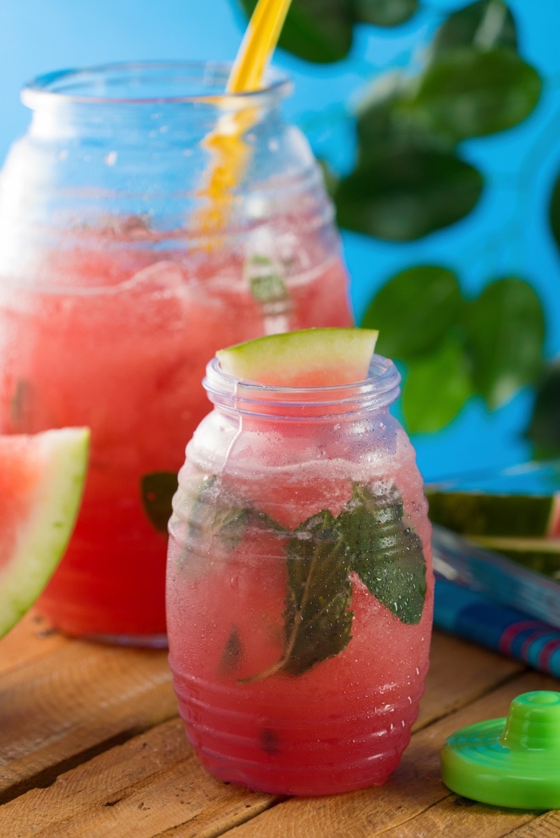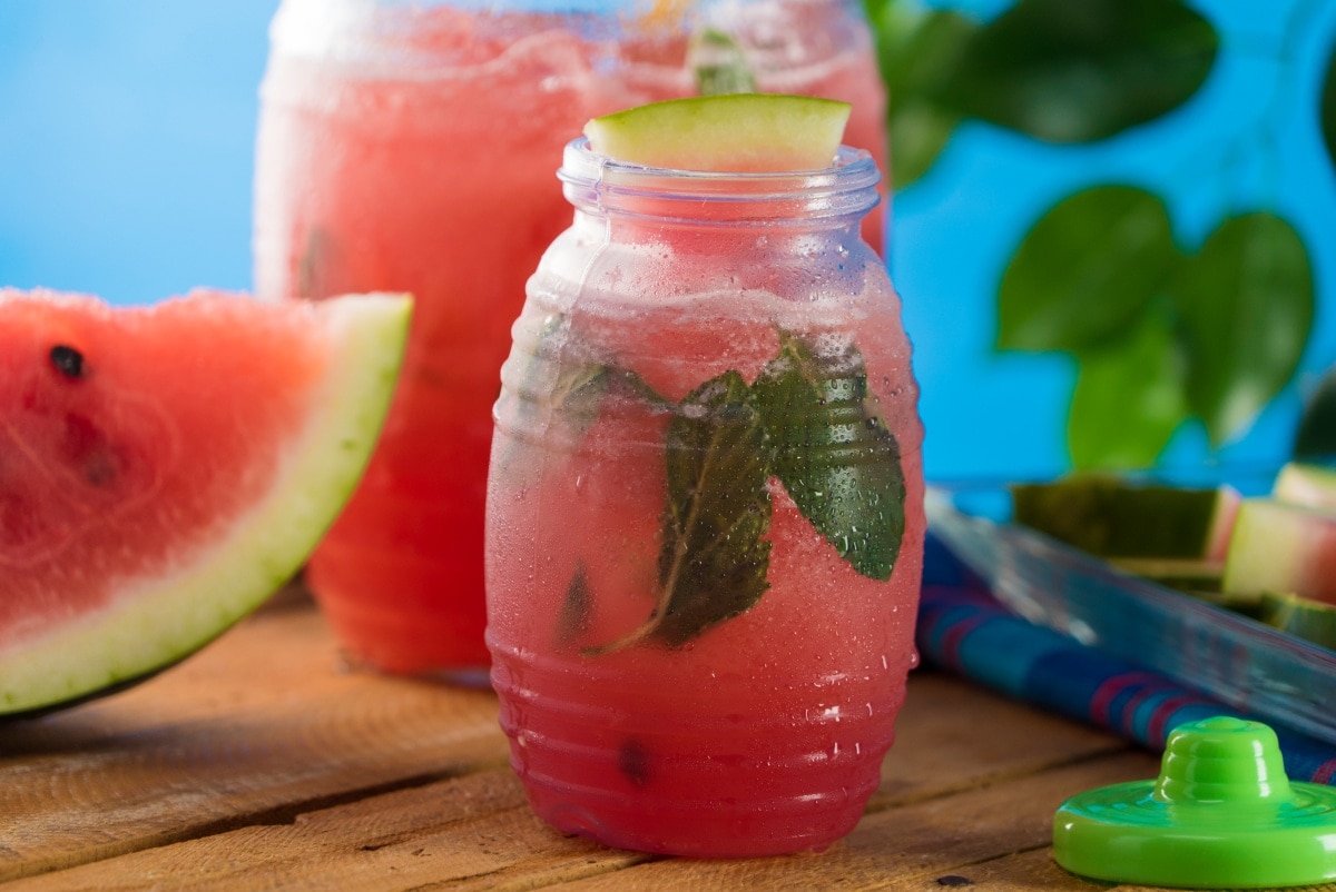 1- Agrega a la licuadora la sandía, el agua, el azúcar y licúa hasta que tengas una mezcla tersa. 2- Sirve hielos en los vasos y agrega el agua. Decora con hierbabuena y abanicos de sandía fresca.