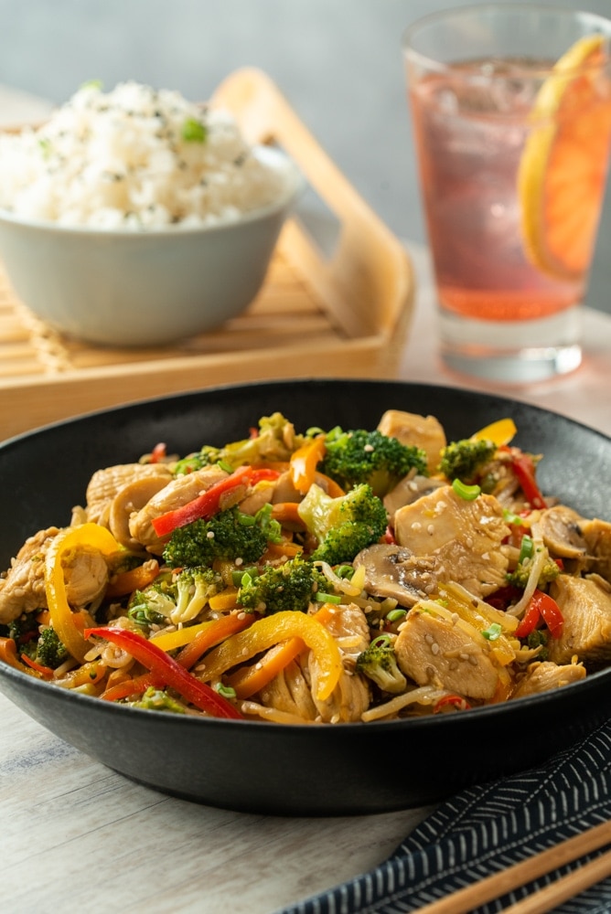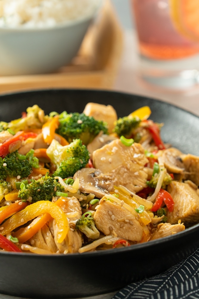 1- Calienta el aceite de ajonjolí en un wok a fuego medio y sofríe la cebolla cambray hasta que esté ligeramente transparente. 2- Agrega el pollo y cocina hasta que esté cocido, añade el apio, los champiñones, el brócoli, los pimiento de colores, el germen de soya, los rabos de cebolla, agrega salsa de soya, el ajonjolí y cocina por 3 minutos más. 3- Sirve en un bowl y decora con rabo de cebolla cambray. Si deseas, añade más salsa de soya.