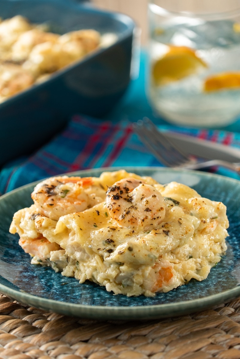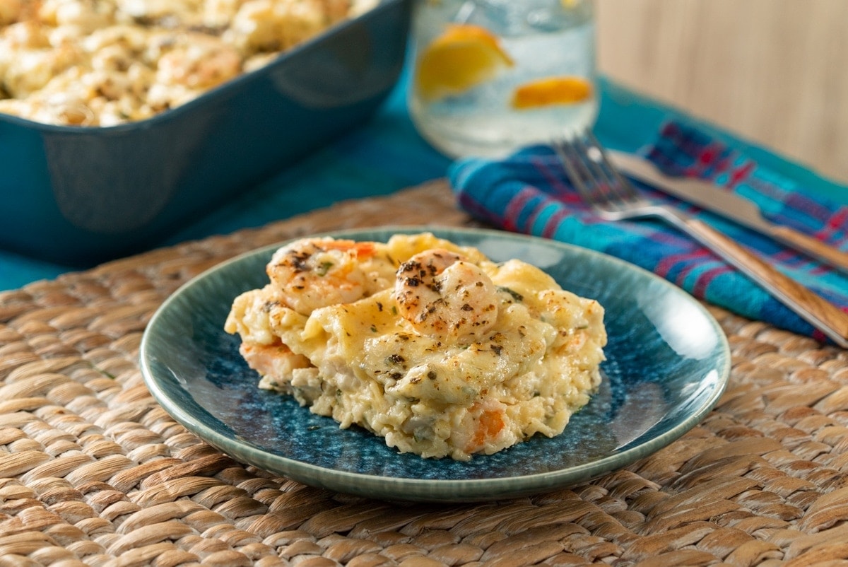 1- Licúa el queso crema, la leche evaporada, la leche entera y el queso parmesano hasta obtener una mezcla homogénea. 2- En una sartén caliente derrite la mantequilla y sofríe la cebolla y el ajo. Incorpora el pescado, el calamar y el camarón; cocina por cinco minutos. Agrega el perejil, vierte el vino blanco y la salsa licuada, sazona con sal y pimienta. Cocina por 5 minutos más y retira del fuego. 3- Precalienta el horno a 180 °C. 4- Arma la lasaña en un refractario para hornear, coloca una capa de láminas de lasaña, una capa de mezcla de mariscos y una capa de queso. Repite hasta terminar con queso. Añade el orégano y hornea por 45 minutos, a 180 °C. 5- Sirve acompañado de baguette rebanado y alguna bebida refrescante.