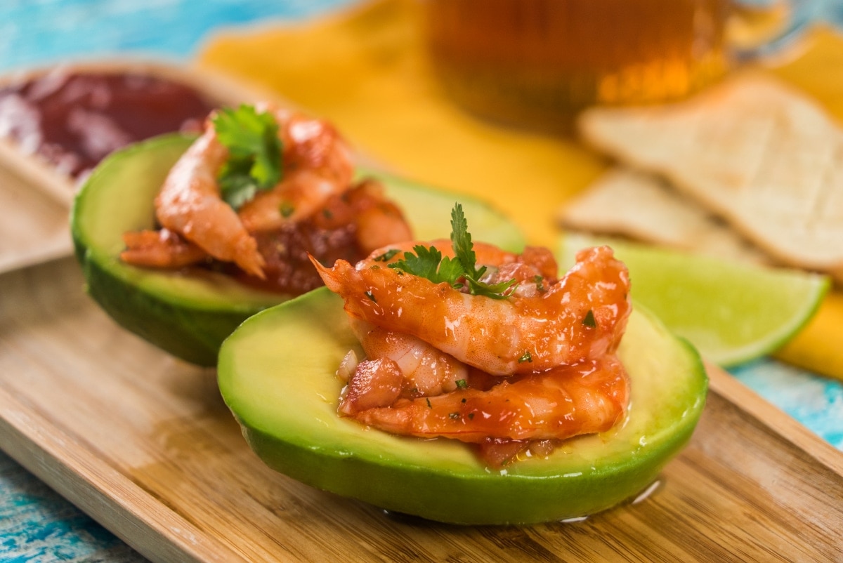 1- En un bowl mezcla el jitomate con la cebolla, el chile serrano, el cilantro, la salsa cátsup, el jugo de tomate y almeja, el limón, el jugo maggi, el aceite de oliva y la salsa tabasco. Incorpora los camarones y reserva. 2- Sobre una tabla corta los aguacates a la mitad y con ayuda de una cuchara retira la cáscara. 3- Sirve en un plato el aguacate y rellena con el cóctel de camarón. 4- Acompaña con las galletas saladas y el limón.
