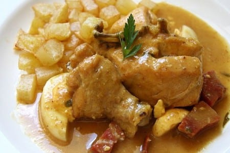 1- Comenzaremos a preparar el pollo en pepitoria picando la cebolla y los ajos en láminas(esto es opcional, puedes picarlos como más te guste). Luego lo pondremos todo a sofreír en una cazuela plana con aceite de oliva cubriendo el fondo y un poco de sal. En que la cebolla comience a transparentar, añadiremos la zanahoria y el pimiento rojo cortados en trocitos, y dejaremos que se vayan cocinando todas las hortalizas a fuego medio-bajo. 2- De forma simulatánea, sazonaremos los muslos de pollo, los pasaremos por harina y los iremos friendo en una sartén hasta que queden bien doraditos. 3- Cuando las verduras estén a medio hacer, pondremos la pimienta negra recién molida y el vino blanco. Dejaremos cocinando despacio hasta que las verduras estén totalmente hechas y luego pondremos el pollo frito. 4- A continuación, verteremos la cantidad de agua suficiente para cubrir el pollo hasta más o menos la mitad, y añadiremos las hojas de romero fresco bien picaditas. Luego pondremos la tapa a la cazuela y dejaremos cocinando el guiso a fuego medio durante 50-60 minutos. 5- En que falten unos 15 minutos para terminar el pollo en pepitoria, machacaremos unas almendras fritas en un mortero y las añadiremos al guiso junto con los champiñones (previamente limpios y con el tallo cortado a ras del sombrero). 6- Una vez tengamos el guiso casi terminado, pelaremos los huevos cocidos y añadiremos cortados en trozos de un tamaño a nuestro gusto. Luego taparemos la cazuela de nuevo y dejaremos el pollo en pepitoria reposando durante 10-15 minutos más, con el fuego apagado, antes de comerlo.