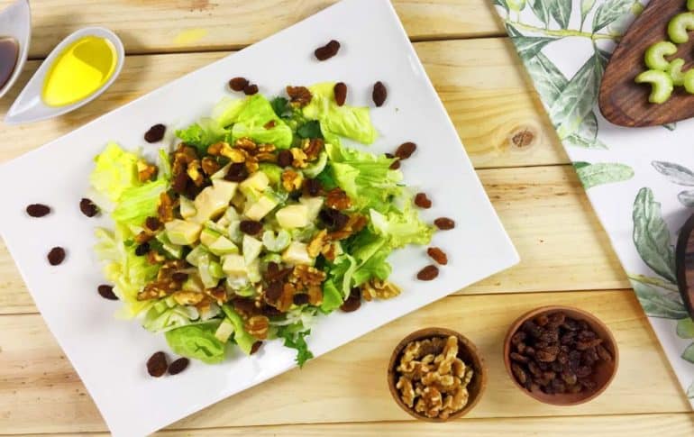 1- Esta sencilla ensalada consta de muy poquitos pasos. El primero será cortar la manzana en pequeños trozos. Lo siguiente, cortar un poco las nueces. Cortamos también el apio. 2- Para el aliño echamos en un bol el vinagre de manzana, la mayonesa, que preferiblemente será mejor si la podemos hacer casera, y la sal. Y lo mezclamos bien. 3- Y en este mismo bol echamos la manzana y el apio, y lo volvemos a mezclar. 4- En un plato aparte, servimos la lechuga. En el centro echamos la mezcla que hemos preparado anteriormente. 5- Y por último decoramos con las nueces y las pasas.
