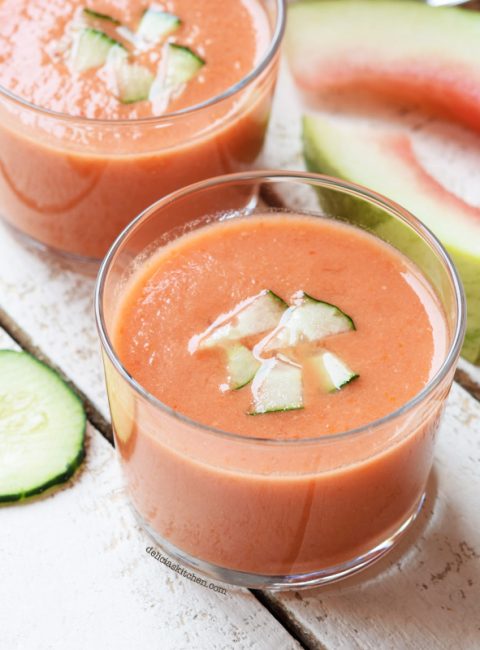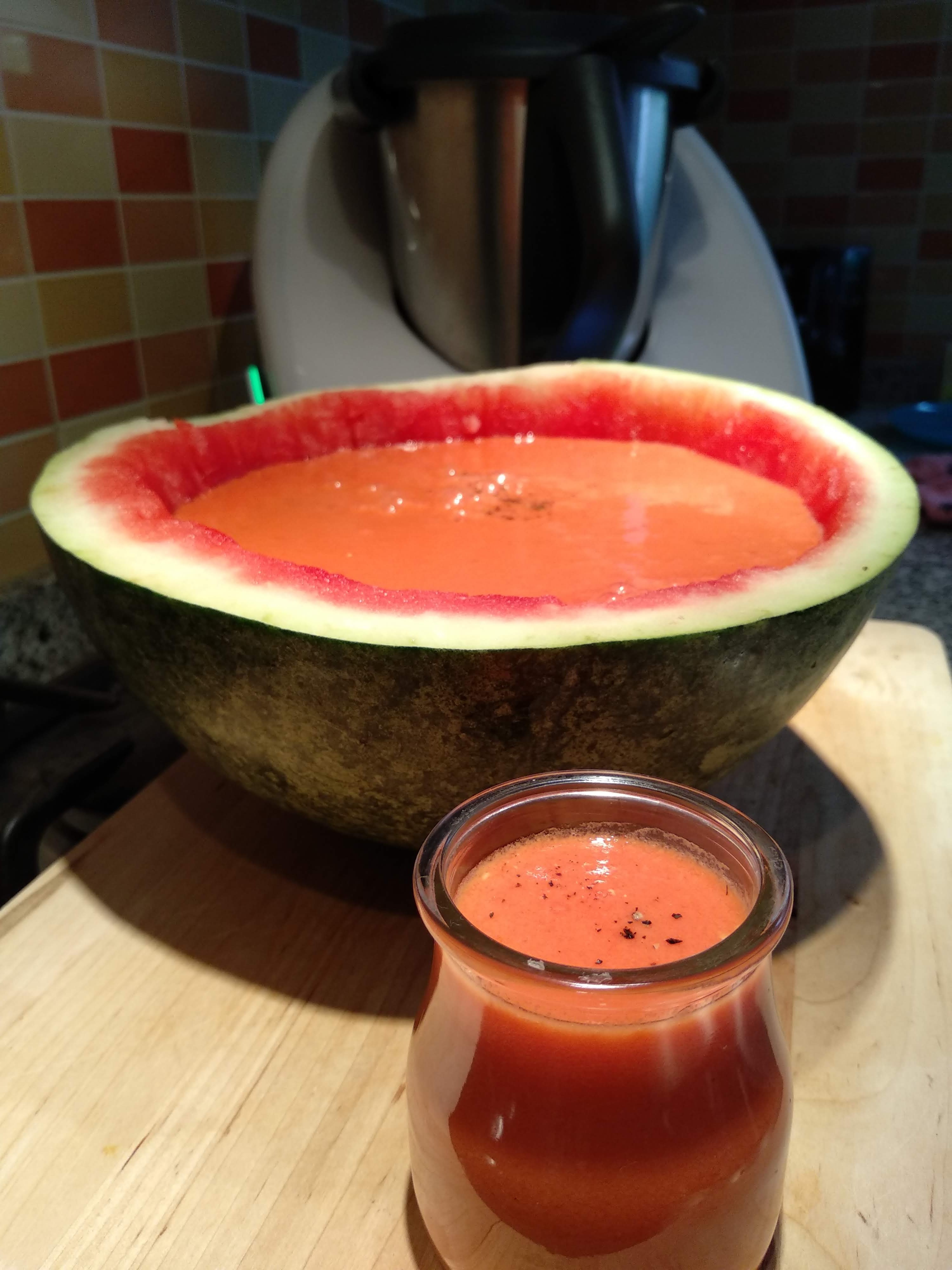 1- Cortar la sandía en dos trozos: una mitad cortarla en trocitos y de la otra mitad sacar unas bolitas usando un sacabolas de helado o una cuchara. 2- En un vaso triturador añadir el pan troceado, un chorro de aceite, sal, pimienta, vinagre de Jerez y la sandía en dados. triturar hasta conseguir una textura homogenea 3- Meter el gazpacho en un recipiente apto para el congelador. Ir rompiendo las capas de hielo con un tenedor cada 20 minutos para conseguir que no se congele del todo. Lo que queremos conseguir es que mantenga una textura de granizado 4- En una copa añadir el gazpacho granizado, unos frutos del bosque y una bola de sandía. 5- Por último, echar encima del granizado un chorrito de cava. Servir inmediatamente con una hoja de menta si se tuviera.