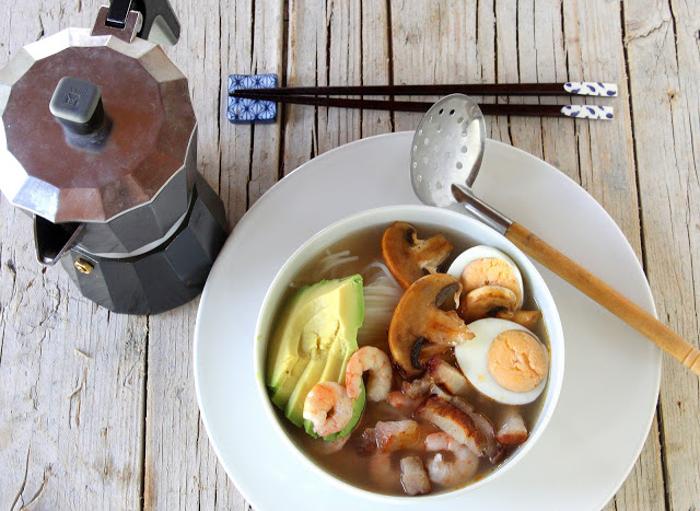1- Empieza troceando las verduras. Corta en trozos medianos la zanahoria y el puerro y haz rodajas finitas con la cebolleta. 2- Pon un cazo con agua en el fuego y espera a que alcance el punto de ebullición. Cuando comience a hervir, echa el huevo entero y cuécelo durante 12 minutos. Pasado ese tiempo, retíralo y ponlo en un recipiente con agua fría para cortar la cocción. 3- Vierte en una cazuela el caldo de pescado y el caldo de carne o cocido. Pon al fuego y, a partir de que alcancen el punto de ebullición, espera 5 minutos. Transcurrido ese tiempo, añade la sal, el ajo, el puerro y la zanahoria. Deja cocer tapado otros 5 minutos. A continuación, agrega las setas shiitake, remueve y espera de nuevo 2 minutos. Finalmente, añade los langostinos, retira la cazuela del fuego y deja reposar tapado durante 3 minutos.