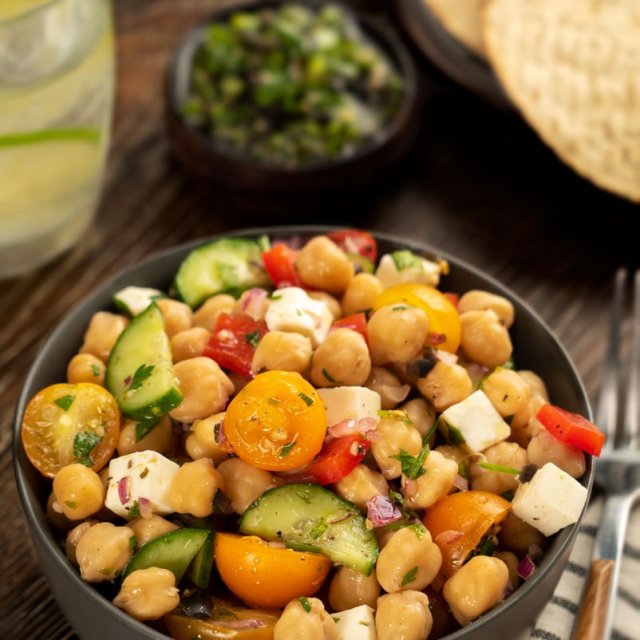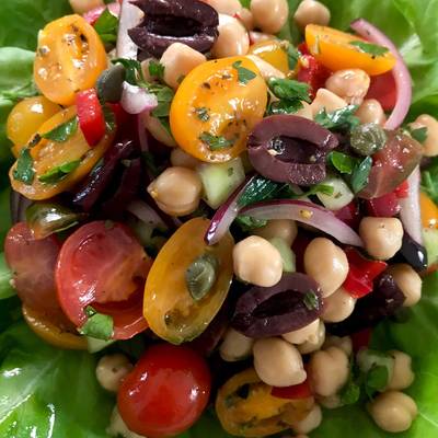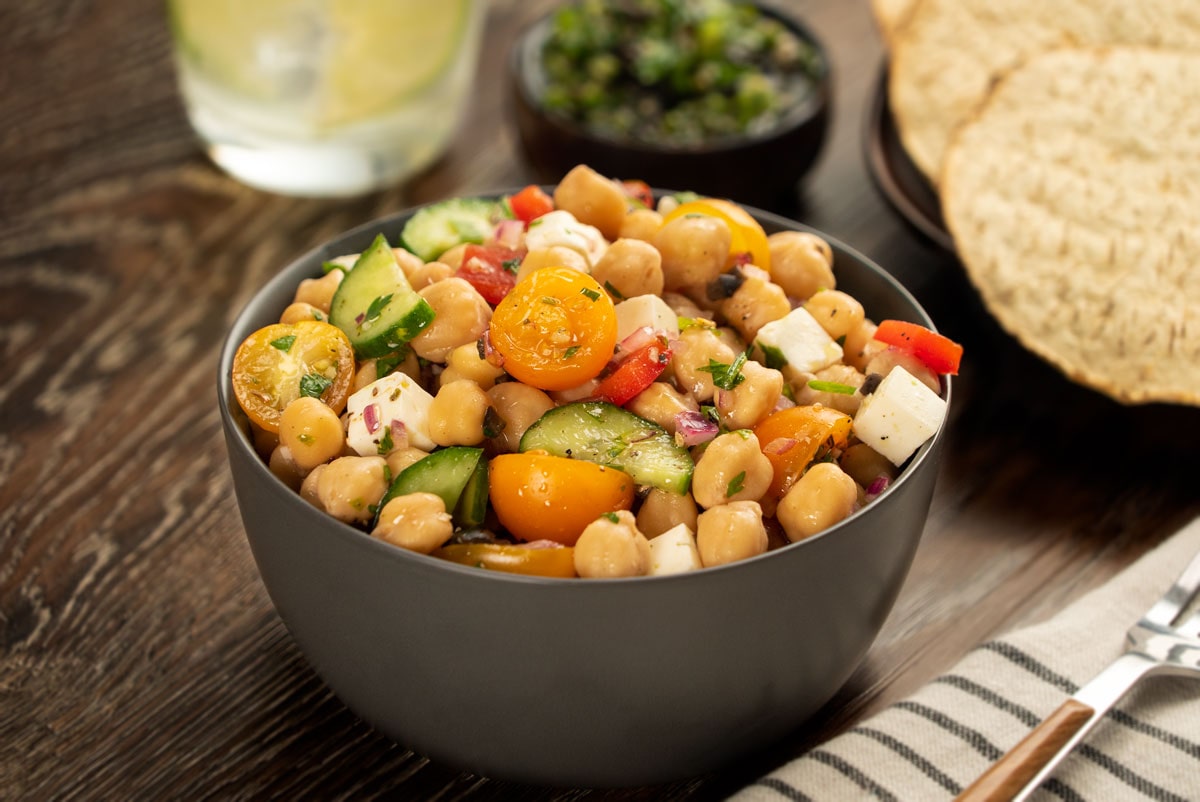 1- En una olla con agua hirviendo, agrega la sal de mar y cocina los garbanzos hasta que estén suaves. 2- Para el chimichurri de aceitunas, mezcla el perejil, el ajo, el chile serrano, las aceitunas negras, el orégano, y el aceite de oliva hasta tener una mezcla homogénea. 3- En un bowl mezcla los garbanzos, la cebolla morada, el jitomate cherry, el pepino, el pimiento, el queso panela, el jugo de limón, añade el chimichurri, la sal y la pimienta hasta integrar por completo. 4- Sirve y acompaña con tostadas horneadas. Disfruta.
