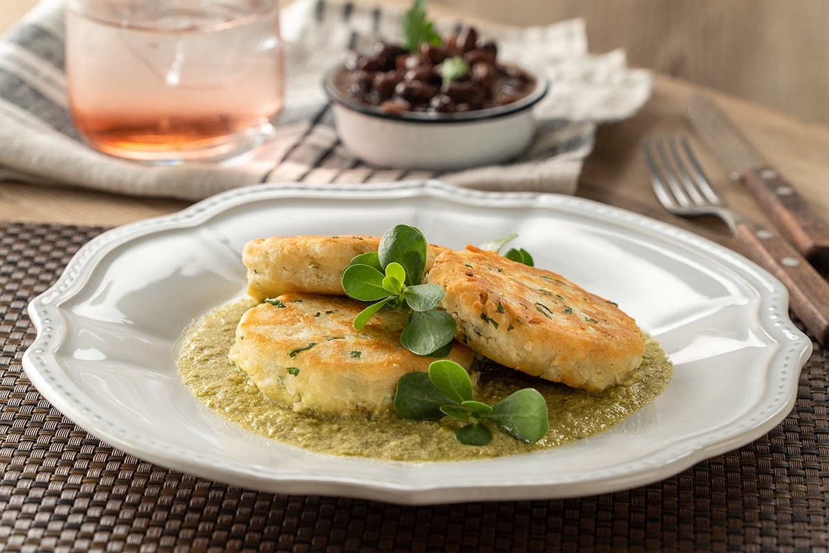 1- Para la salsa, vierte el aceite vegetal sobre un sartén caliente, sofríe la cebolla y el ajo. Agrega el chile serrano, el tomate verde, el comino y el cilantro, cocina por 3 minutos y vierte el caldo de pollo. Sazona con sal y pimienta y deja hervir suficiente tiempo. 2- Retira del fuego y licúa hasta obtener una salsa espesa. Reserva. 3- En un bowl agrega el requesón junto con el yogurt natural, la cebolla, el cilantro, el ajo en polvo, el polvo para hornear, la harina y el huevo. Sazona con sal y pimienta. 4- Mezcla hasta obtener una masa fácil de manipular. 5- Engrasa tus manos con un poco de aceite vegetal, forma las tortitas y repite el proceso hasta terminar con la masa. Refrigera por 10 minutos. 6- Vierte suficiente aceite vegetal sobre una sartén caliente. Fríe las tortitas de requesón y escurre sobre papel absorbente. Reserva. 7- En un sartén con aceite vegetal caliente vierte la salsa y cocina por 10 minutos. Reserva. 8-En un plato sirve un poco de salsa verde, coloca las tortitas de requesón y cilantro. Decora con verdolagas.