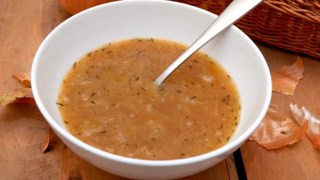 1- Comenzaremos a hacer esta salsa de cebolla, pelando y cortando en láminas tanto la cebolla como los dientes de ajo. La cebolla queda en tiras muy finas al deshacerse las capas. 2- Luego ponemos una cazuela con aceite de oliva a calentar y cuando lo esté, ponemos en su interior la cebolla y el ajo picados, y los rehogamos a fuego lento. 3- Vamos a dejar que se vaya cocinando la cebolla y en el momento en el que empiece a dorarse, le añadiremos las dos pastillas de caldo de carne. Si tenéis a mano un poco de caldo de carne roja por ahí, podéis sustituirlo por las pastillas y el agua. 4- Cuando comiencen a deshacerse las pastillas, ponemos una cucharada colme de harina y la removemos para que se cocine un poco. Seguidamente ponemos agua, más o menos meido litro aunque no debéis preocuparos por la cantidad ya que luego reducirá. Dejamos que se cocine todo junto durante 5 minutos. 5- Ahora tenemos que triturar la cebolla para hacer la salsa. Cuando esté todo líquido pasamos la salsa por el colador para que nos quede fina. Luego la dejamos reduciendo y controlando que quede a nuestro gusto en potencia de sabor.