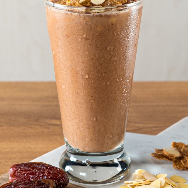 1- Licúa la leche de almendras con la cocoa, los dátiles, la esencia de vainilla, la nuez moscada y cereal miel y almendras por 3 minutos. 2- Sirve el licuado y decora con almendras fileteadas y chocolate rallado.