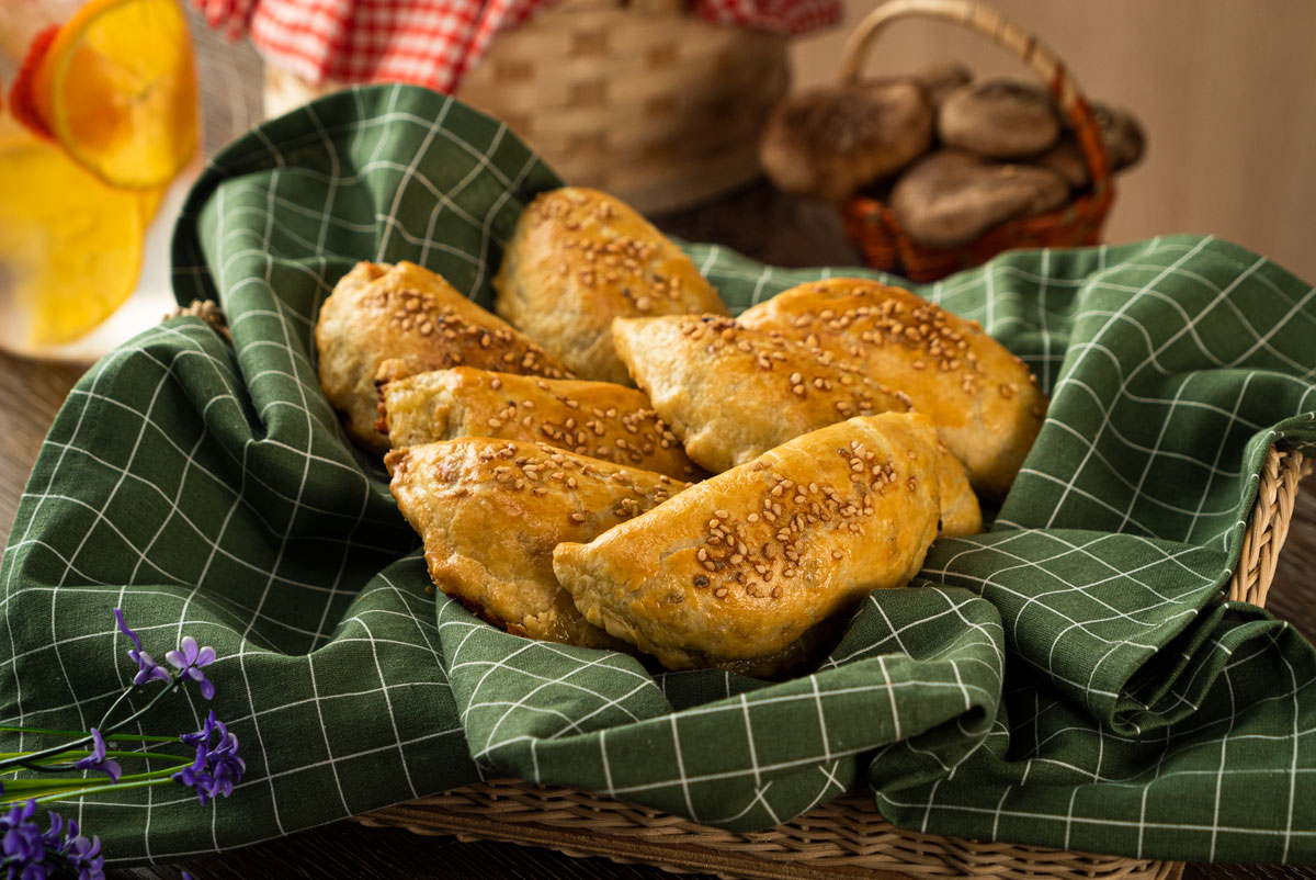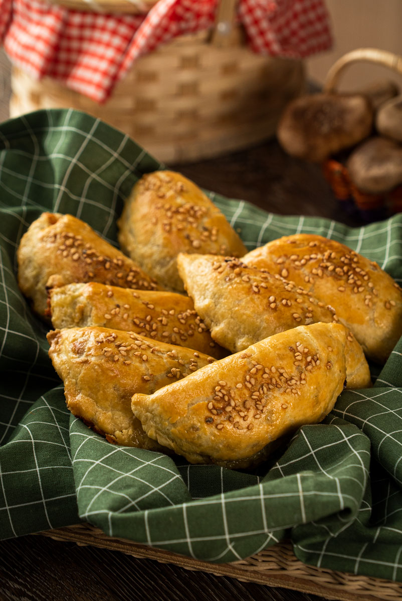 1- Calienta una sartén a temperatura media y agrega la mantequilla, la cebolla, el ajo, los champiñones, el orégano y sazona con sal y pimienta. Agrega las espinacas y cocina por 7 minutos. Enfría. 2- Estira la pasta hojaldre y corta círculos para formar las empanadas. Rellena con las espinacas, granos de elote y queso, cierra y forma la empanada. Barniza con huevo, agrega ajonjolí y hornea a 180 °C por 20 minutos.