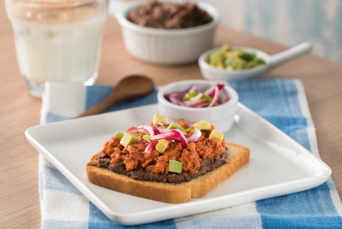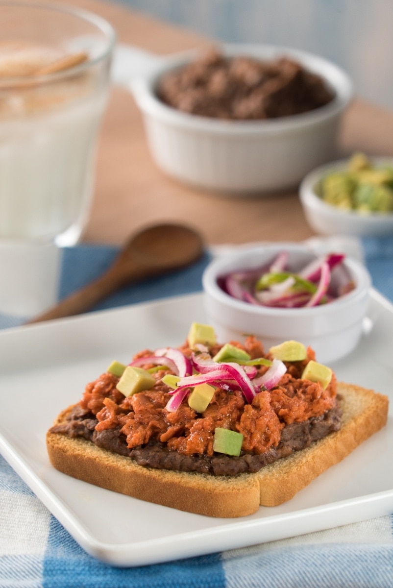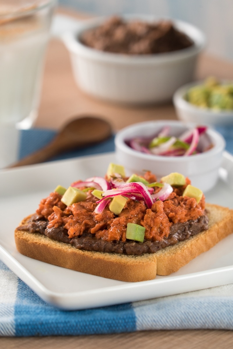 1- Licúa el achiote con el jugo de naranja, el vinagre blanco, el ajo, el orégano, el comino, la sal y la pimienta. 2- En un bowl, mezcla el atún con la preparación anterior y marina 10 minutos en refrigeración. 3- En un sartén a fuego medio calienta el aceite y cocina el atún por 5 minutos o hasta que el líquido se haya reducido. Rectifica sazón y reserva. 4- Sobre un pan tostado unta un poco de frijoles refritos, agrega el atún al pibil decora con aguacate y cebollas encurtidas.
