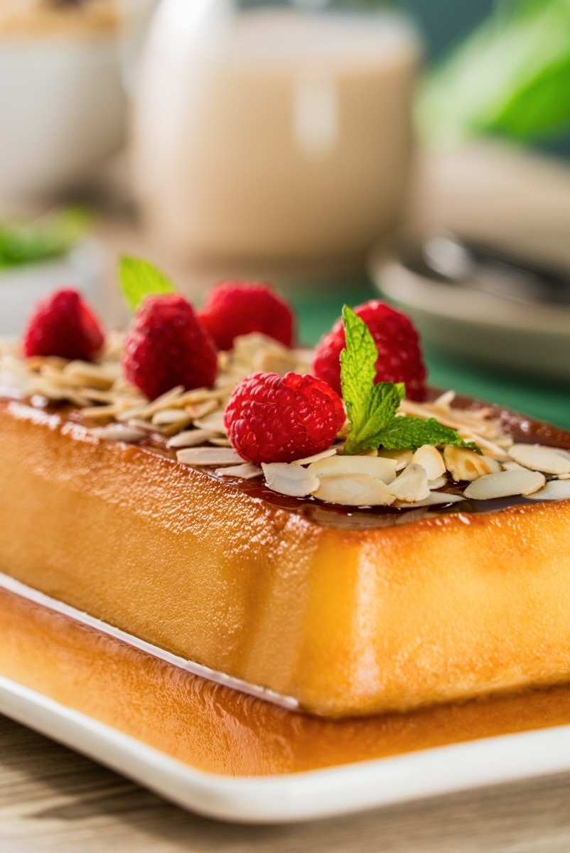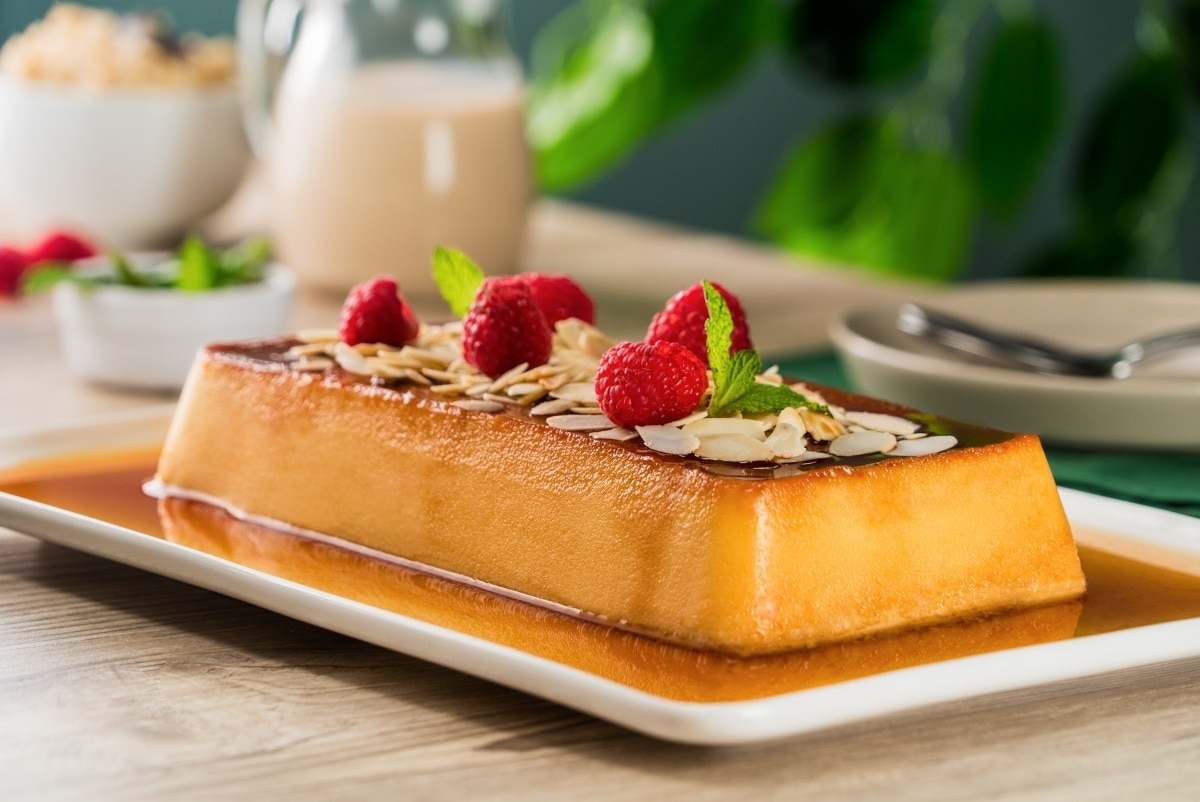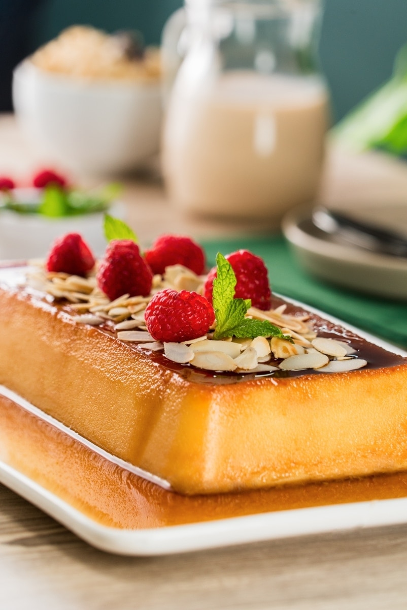 1- Precalienta el horno a 180°C. 2- Para el arroz con leche, calienta la leche de soya con el arroz, la canela, la esencia de vainilla y la ralladura. Cocina a fuego medio por 20 minutos o hasta que el arroz esté cocido. Deja enfriar y reserva. 3- Para el flan, calienta el azúcar a fuego medio hasta obtener un caramelo, vierte en moldes individuales o en un molde para flan de 20 cm de diámetro. Deja secar. 4- Licúa el huevo con la leche de soya, el azúcar, la esencia de vainilla y el arroz con leche hasta obtener una mezcla muy tersa y homogénea. 5- Vierte en los moldes con caramelo y cubre con papel aluminio. Hornea a baño maría hasta que estén cocidos, alrededor de 40 minutos. 6- Retira del horno, enfría y desmolda. Refrigera antes de servir y decora con frambuesas, menta y almendras.